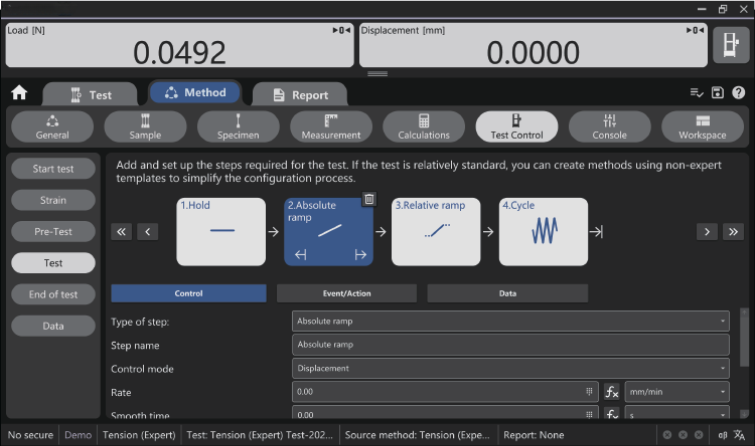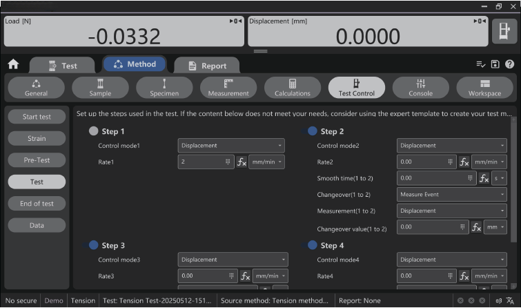 Close-loop control: It has a three-closed-loop (force, extention, displacement) control function, realizing full-digital three-closed-loop control of force, deformation, and displacement. Automatic switching between the control loops is possible. Smooth and seamless transitions are achieved when switching between different control modes.