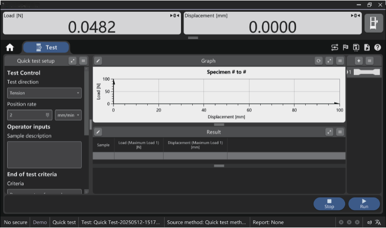 12. Specimen protection: When Online, click to remove initial force on specimen caused by gripping