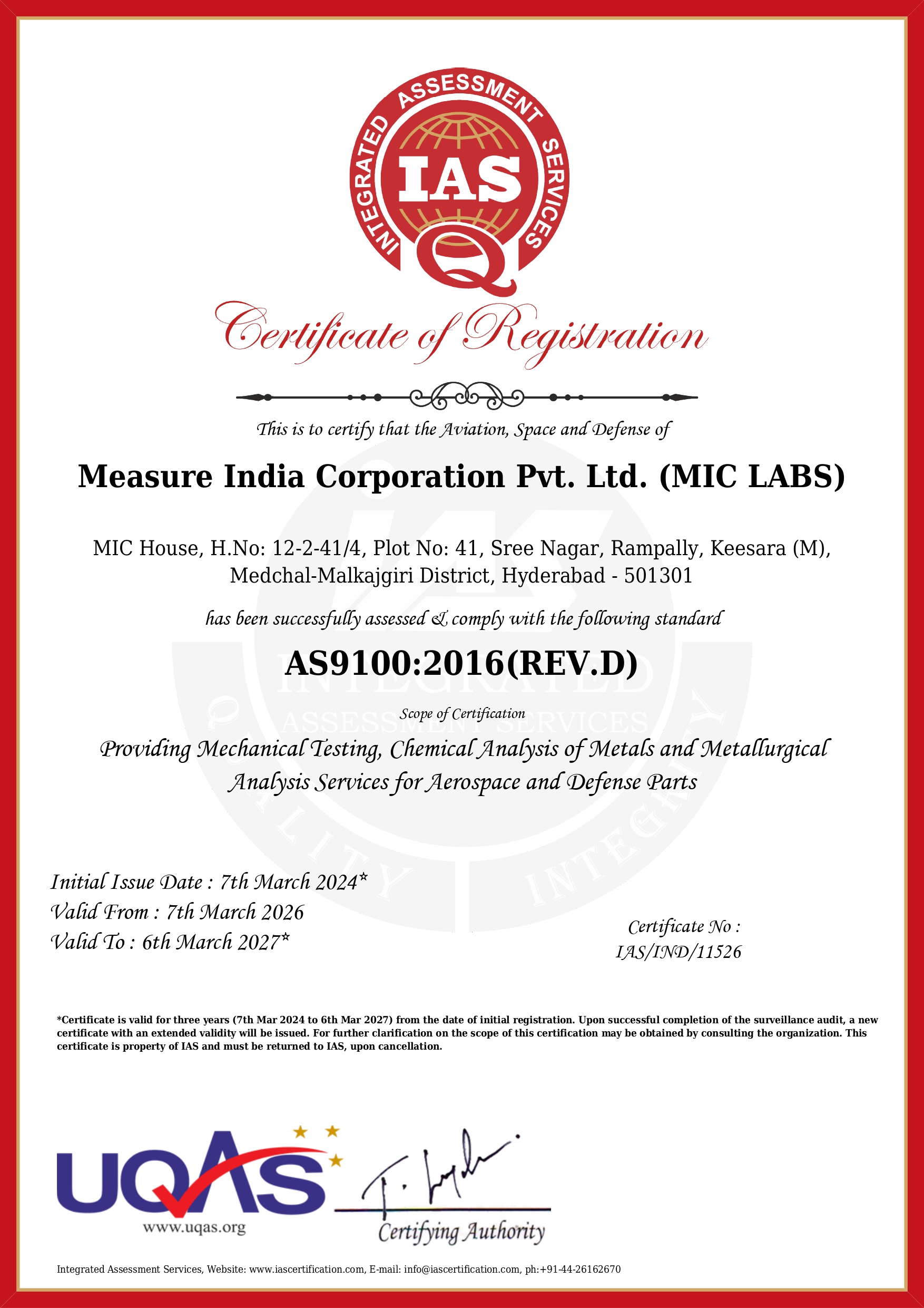 MIC Labs is certified by IAS in accordance with AS9100:2016.