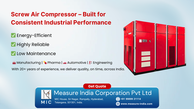 Measure India Corporation Pvt. Ltd., based in Hyderabad, offers a high-efficiency Screw Air Compressor designed for consistent performance across a wide range of industrial applications. Built with durable components and a compact structure, this compressor is ideal for factories, workshops, and production units that require a reliable source of compressed air for continuous operations.